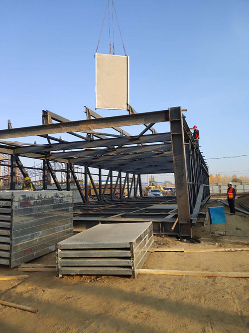 鋼骨架輕型板適用于輸煤棧橋、公共民用等建筑圍護屋面、樓面、墻面.鋼骨架輕型板由輕型鋼骨架、冷拔鋼絲網、改性水泥珍珠巖復合芯材(專有技術)、復合抗滲耐磨涂層(專有技術)組成.鋼骨架輕型板集輕質、承重、節能、防火、隔聲、泄爆、抗震等功能于一體,既保持了傳統鋼筋混凝土構件安全度高、使用壽命長的優點,又滿足了現代建筑對輕質、節能、環保的要求。